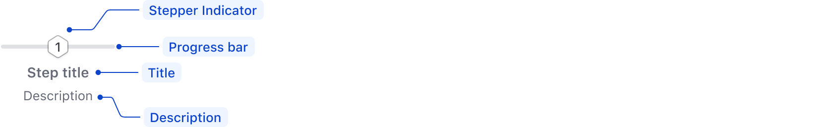 The Stepper Nav supports a title and an optional description. Content should be limited to only what is necessary, and long form content should live within the body of the Step.